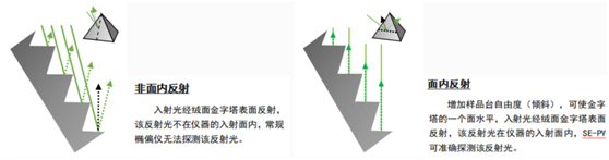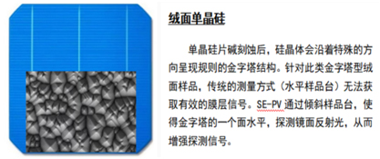 SE-PV獨(dú)特的設(shè)計(jì)可以滿足絨面基底上薄膜的量測需求,如下圖所示的樣品,絨面及其表面增透膜層的設(shè)計(jì)都是為了降低電池片表面對太陽光的反射,這使得探測信號變?nèi)酰蟠笤黾恿斯鈱W(xué)測量難度。