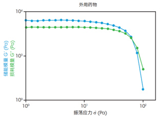 在此圖中,在線性黏彈性區(qū)域以低應(yīng)力測(cè)量的外用軟膏顯示出固體樣行為(G'>G”)。應(yīng)力增加導(dǎo)致軟膏開(kāi)始流動(dòng),顯示的屈服應(yīng)力為66Pa,這是確保有效分配、涂抹和穩(wěn)定性的關(guān)鍵信息。