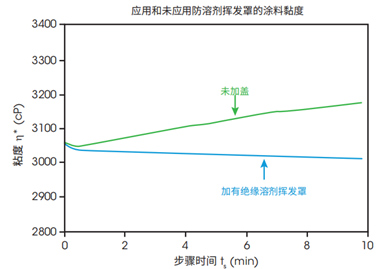 以下為在應(yīng)用和未應(yīng)用絕緣防溶劑揮發(fā)罩的情況下測(cè)量丙烯酸涂料在10s-時(shí)的黏度。在未加蓋的情況下,涂料在邊緣干燥時(shí)會(huì)增加扭矩,表現(xiàn)為黏度增加。安裝防溶劑揮發(fā)罩后,干燥的影響被消除,因此可精確測(cè)量涂料黏度。
